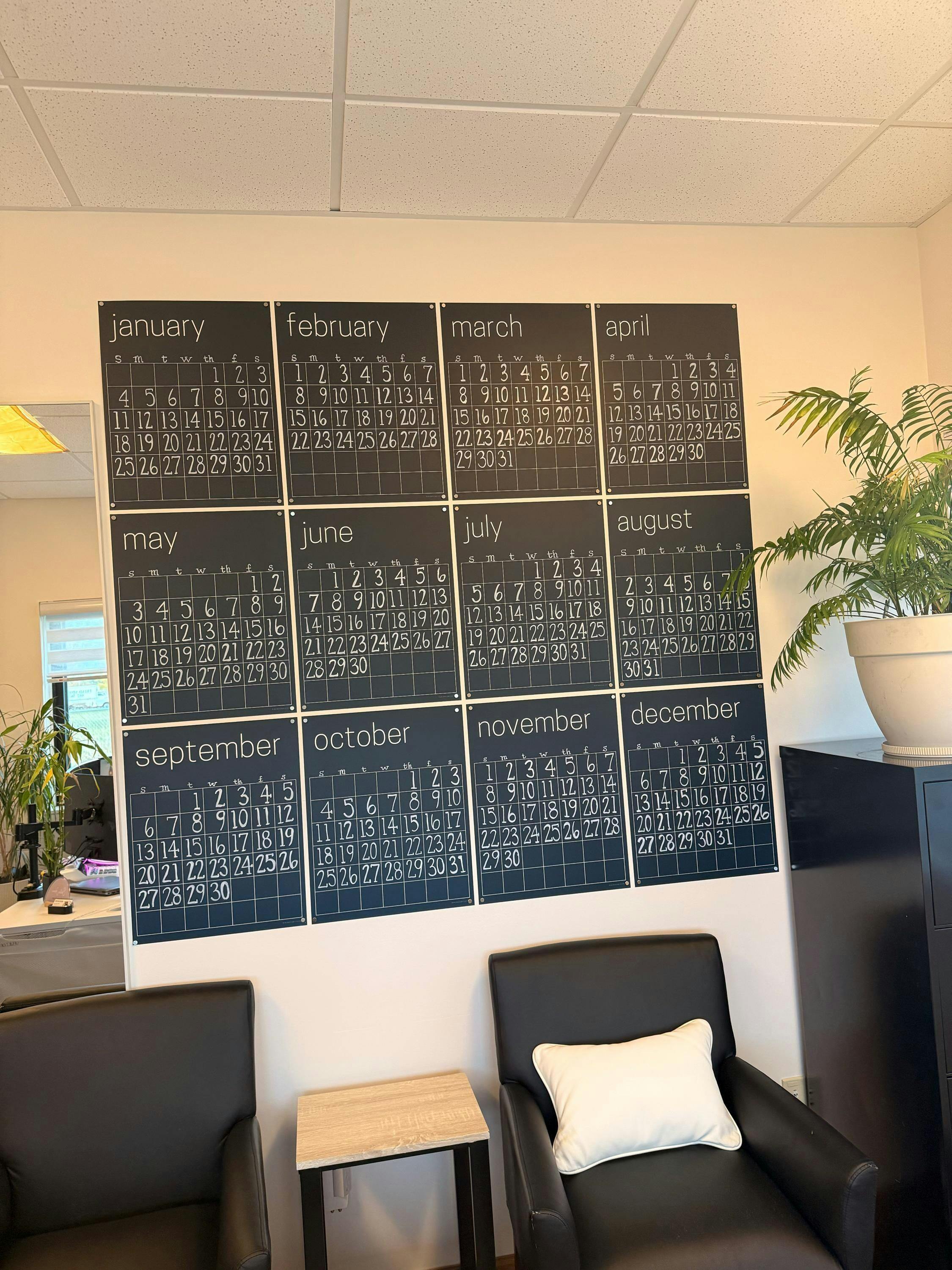 Hang all 12 at a time, 4 at a time, 3 at a time (perfect for businesses that are focused on quarterly goals), or even 1 at a time. You can find lots of different spacing and layout ideas here: https://shopthekaleidoscope.com/calendar-tips