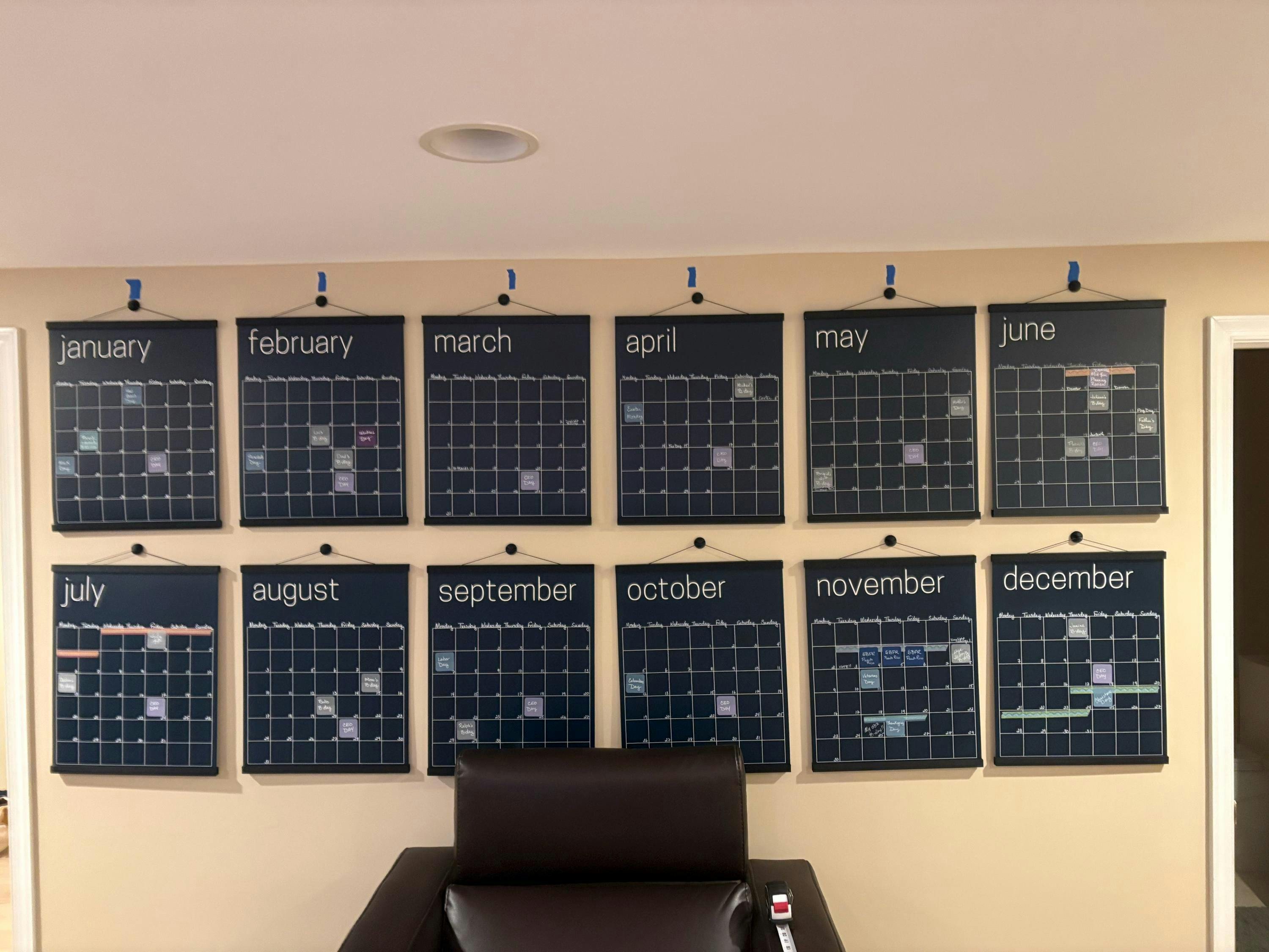 Love the colors and look of our new organization calendar! We used the recommended markers and tape and bought a dozen frameless frames. We love how we can see the year at a glance for major events and meetings from across the organization. YAY!!