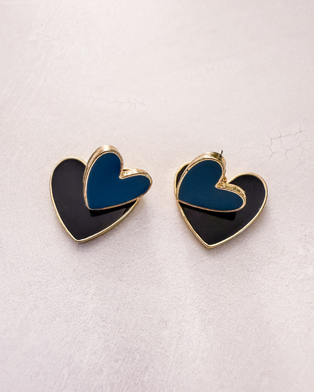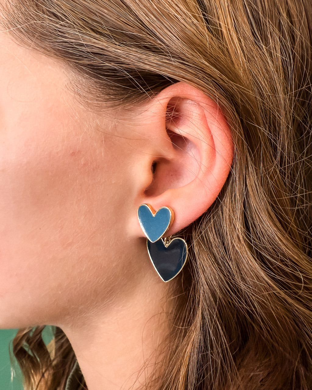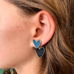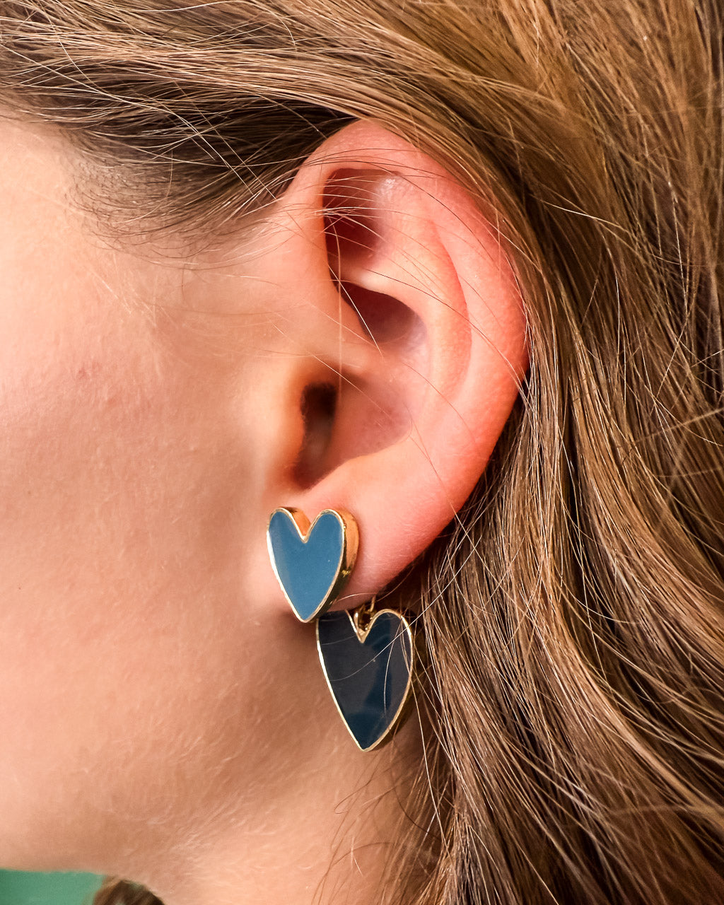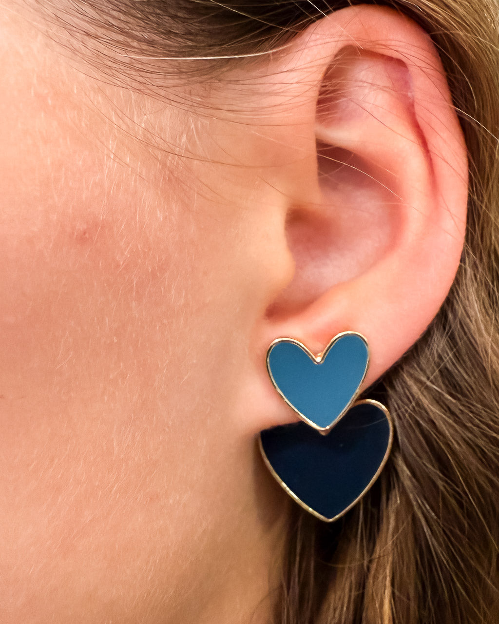 We bet you've never seen this unique earring design before! Instead of the hearts being attached to each other, the post is connected to the top heart while the earring backer is connected to the bottom heart. The result is that the bottom heart sits behind your ear lobe, almost giving the illusion that the bottom heart is floating on its own. Available in blue and red.
