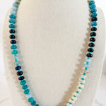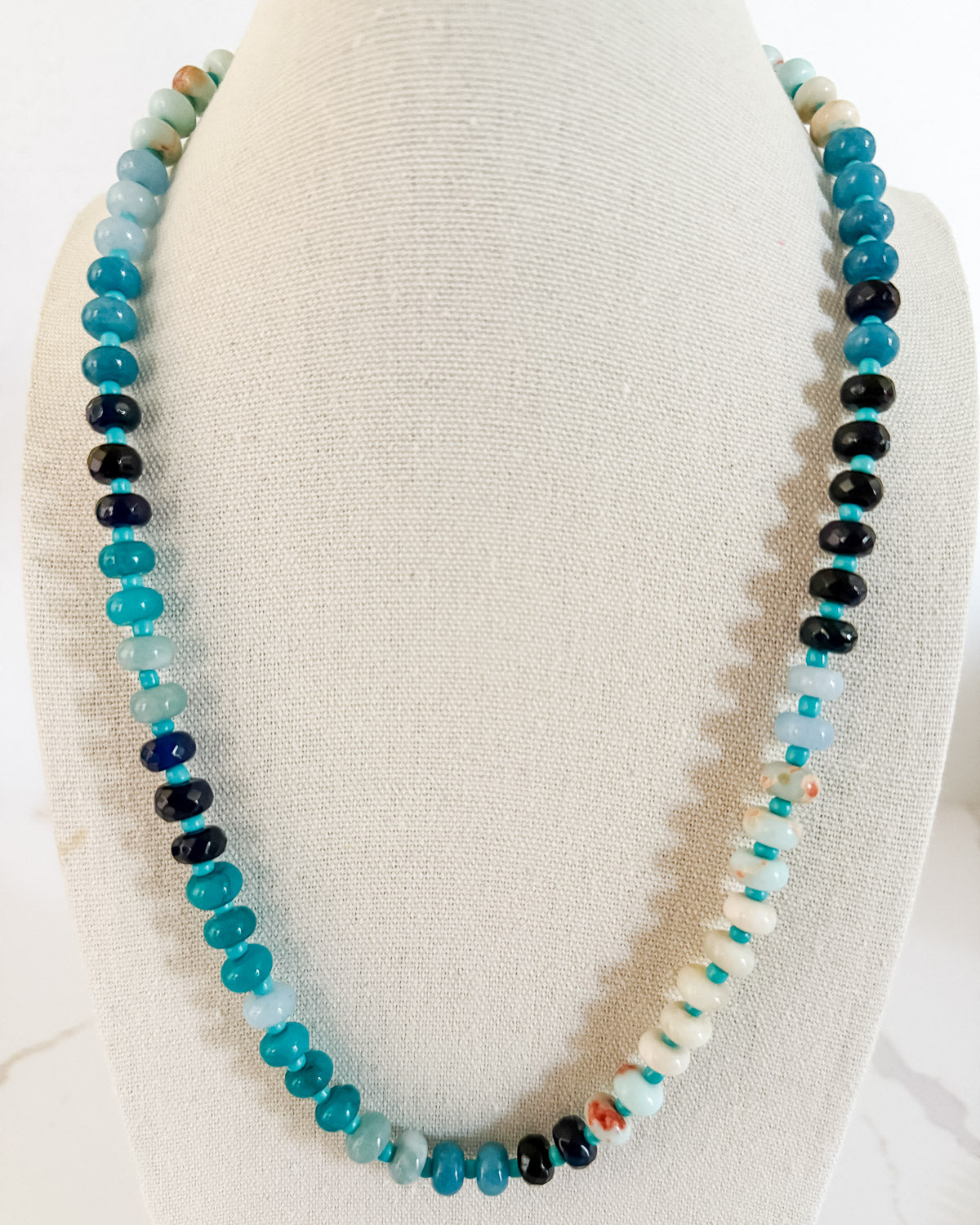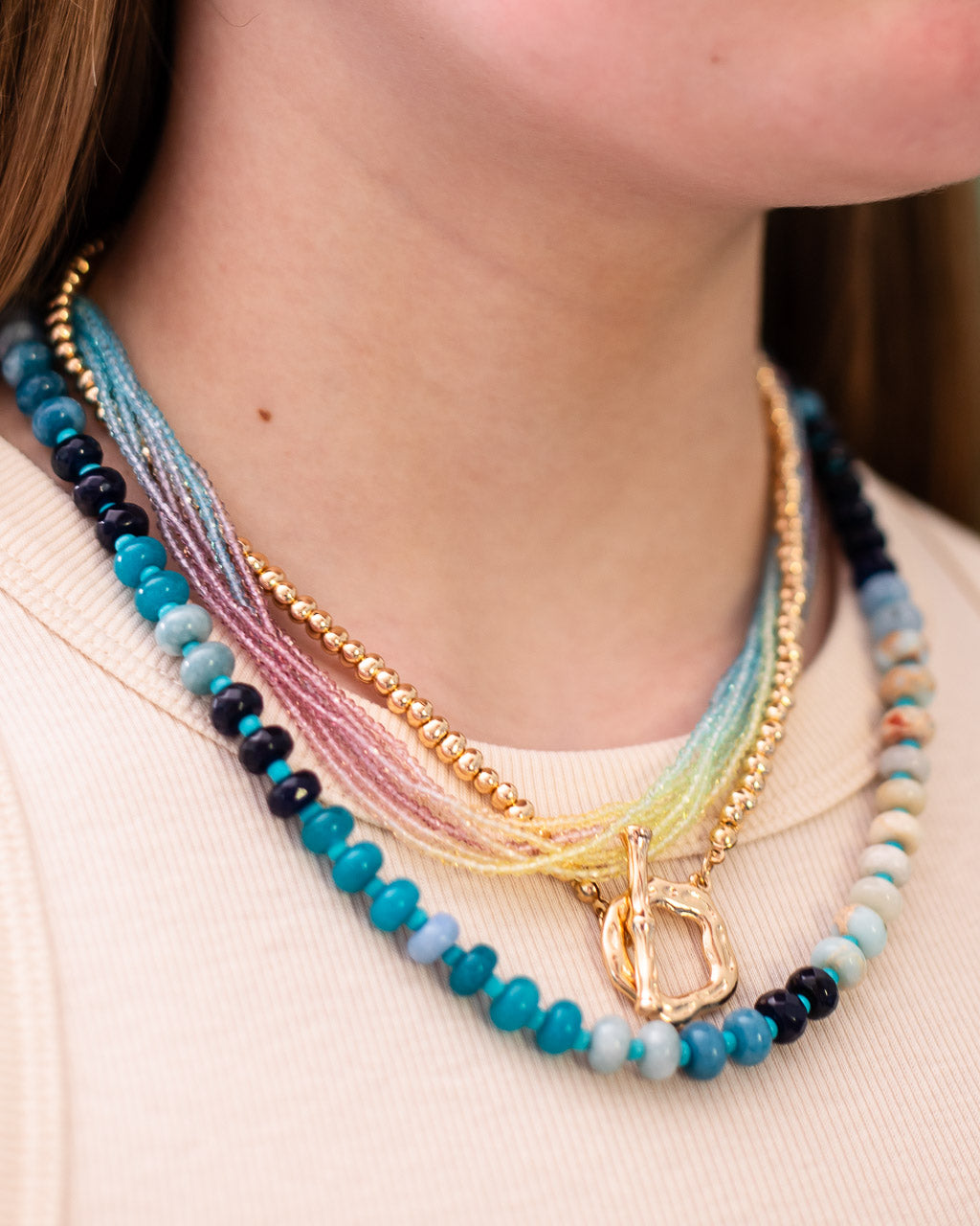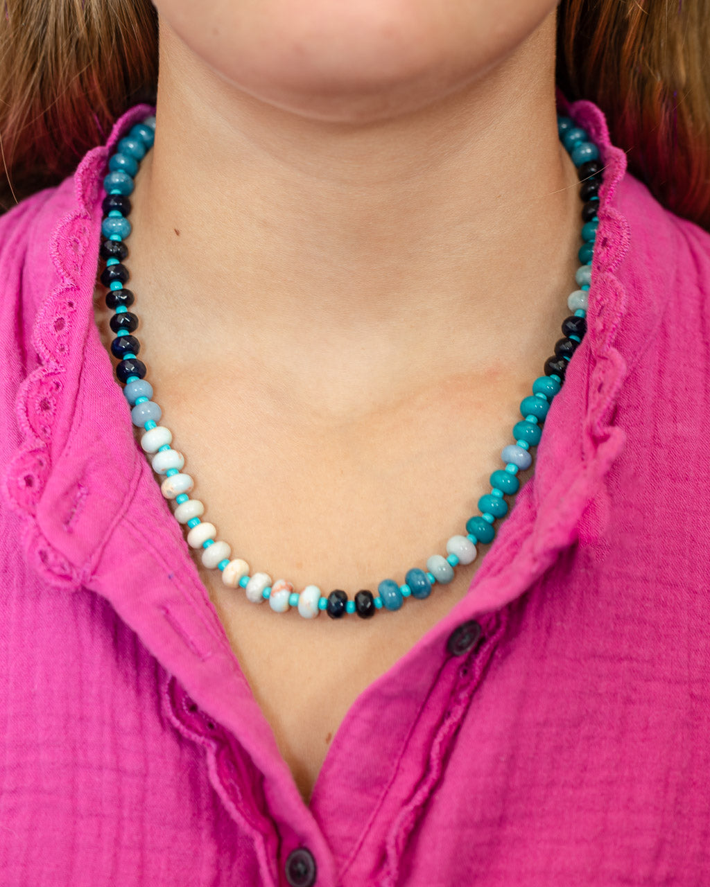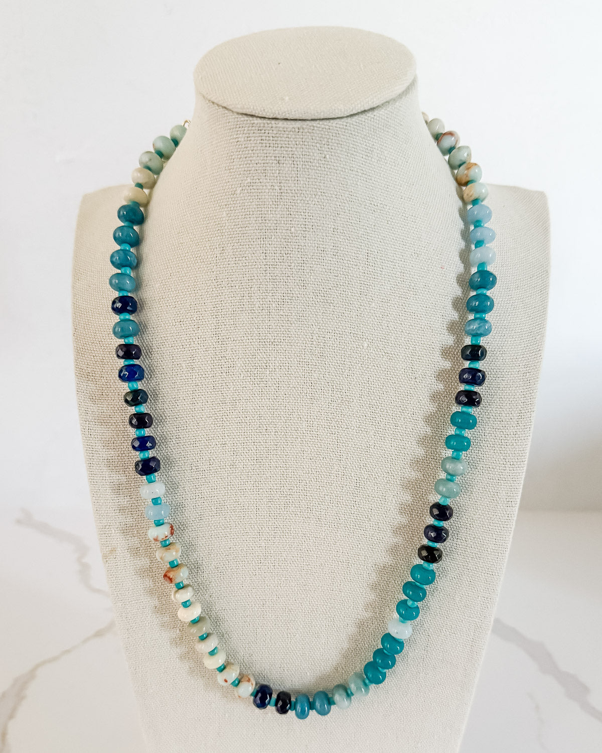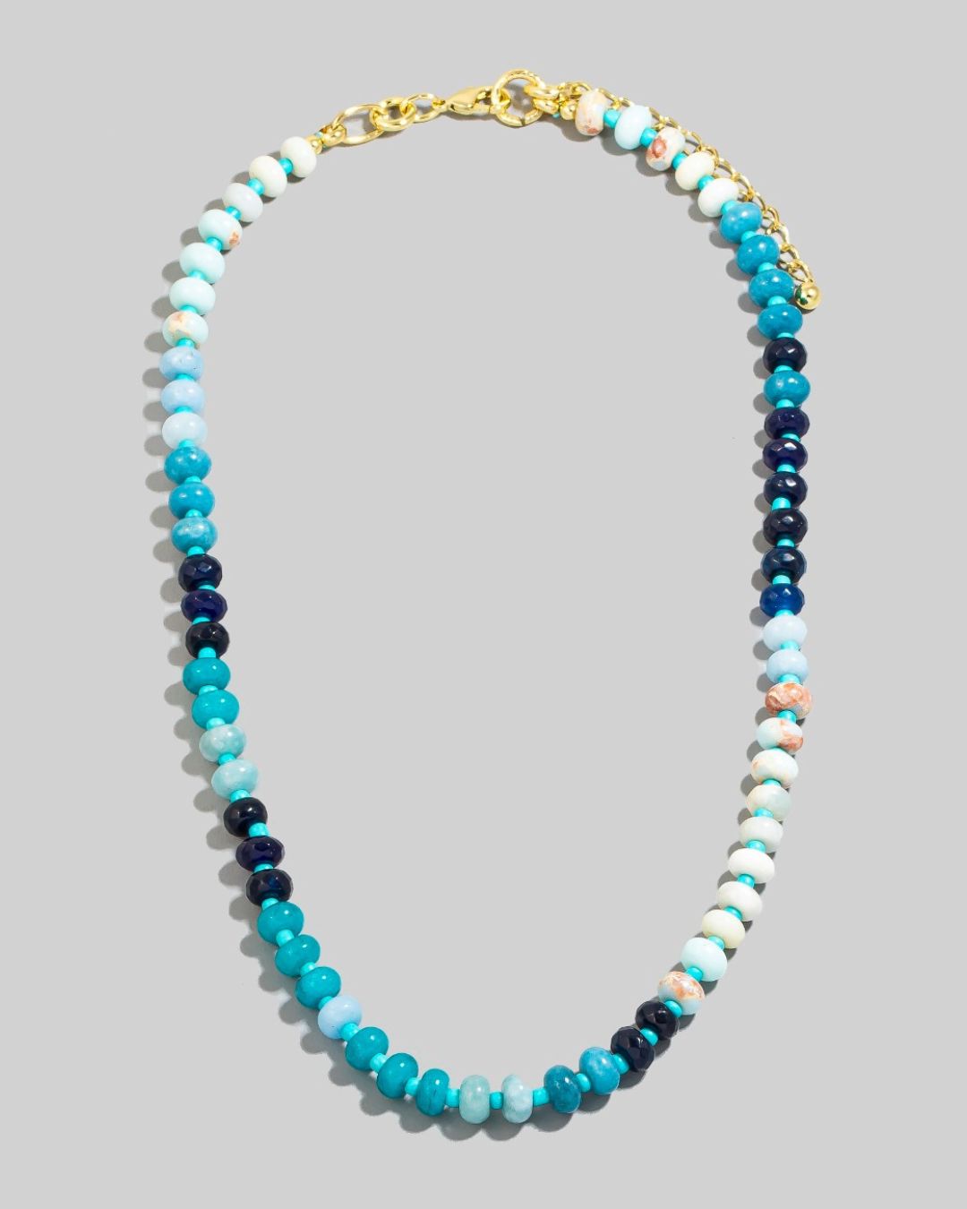 Inspired by the rhythmic ebb and flow of the ocean, this necklace features a stunning gradient of natural stone beads in serene shades of white and blue. From soft ivory to misty sky and deep sea hues, it mirrors the movement of the tides.