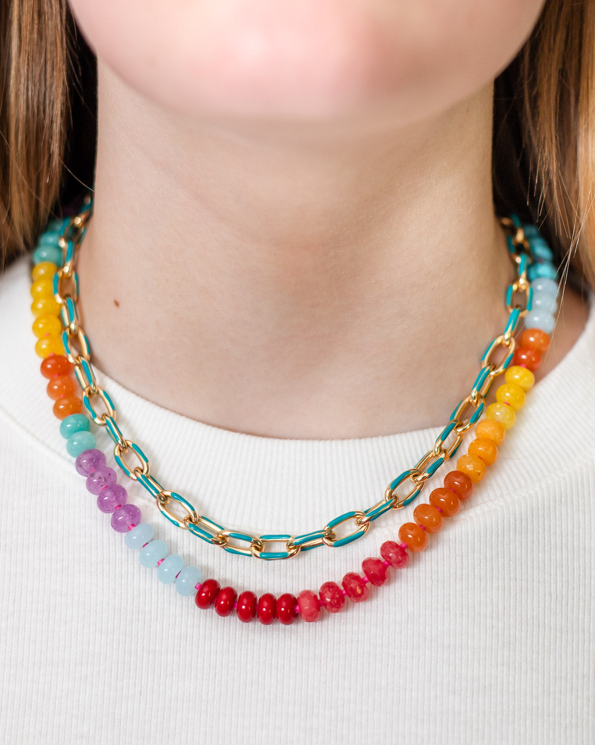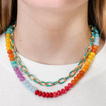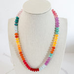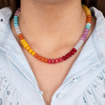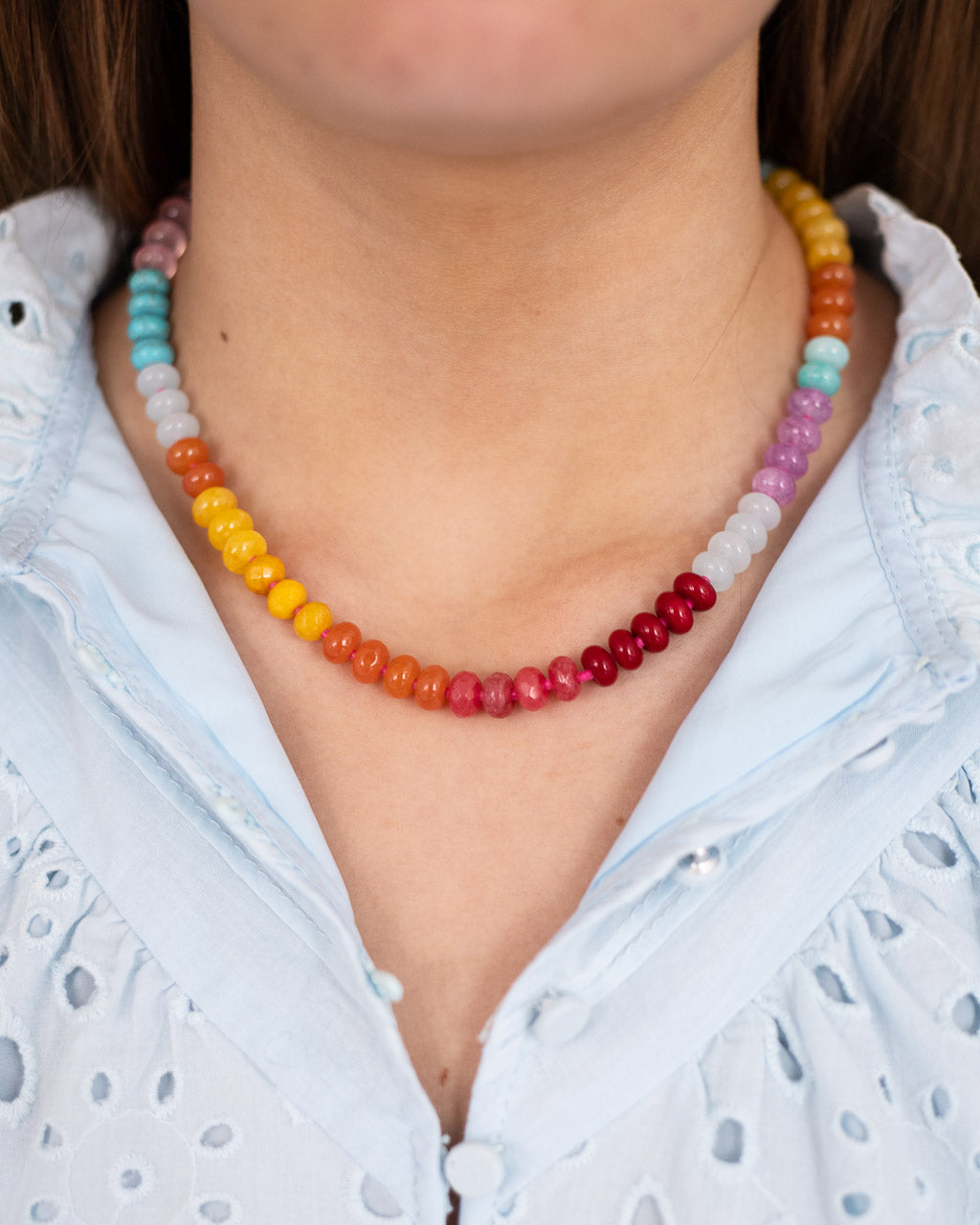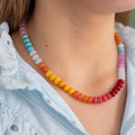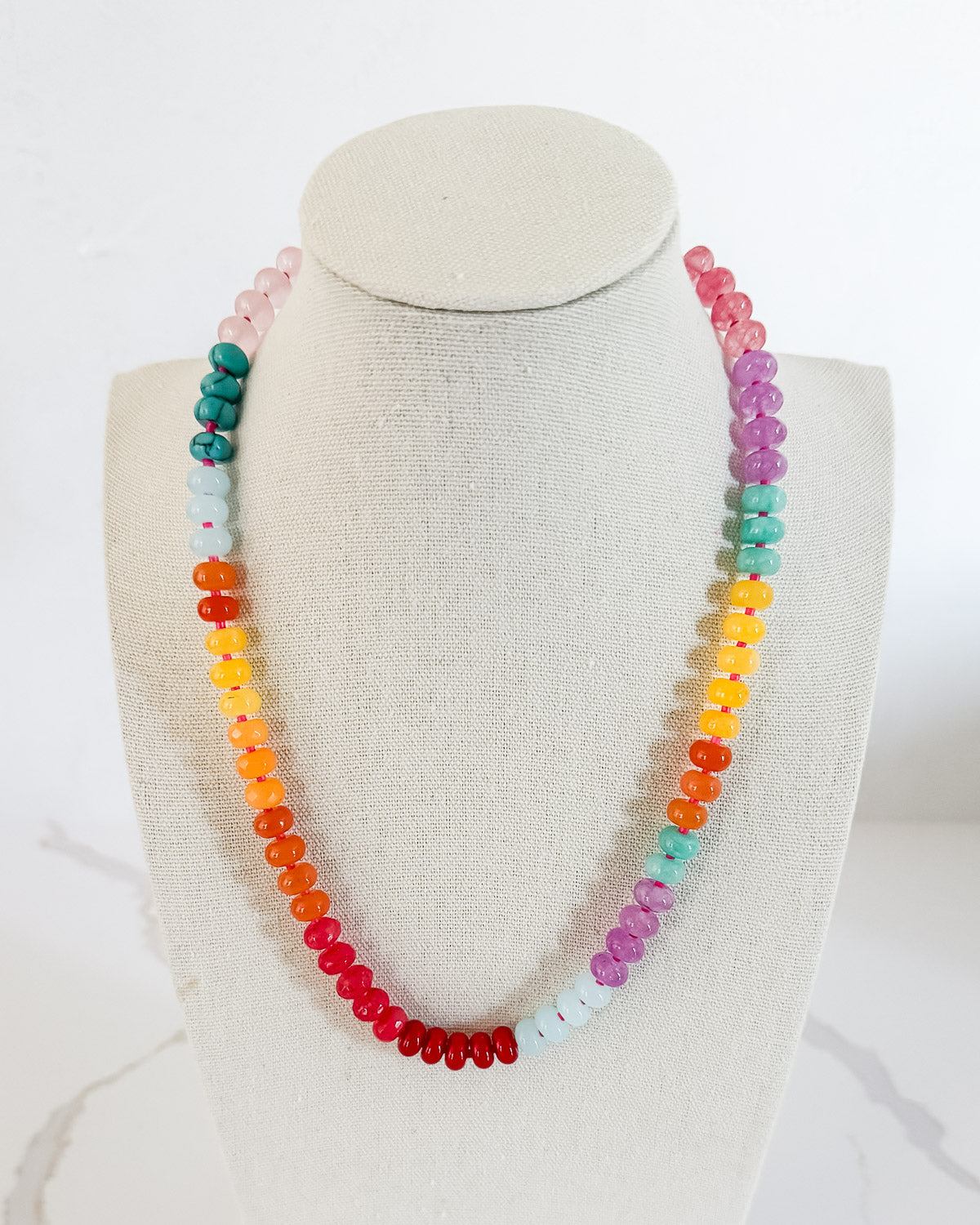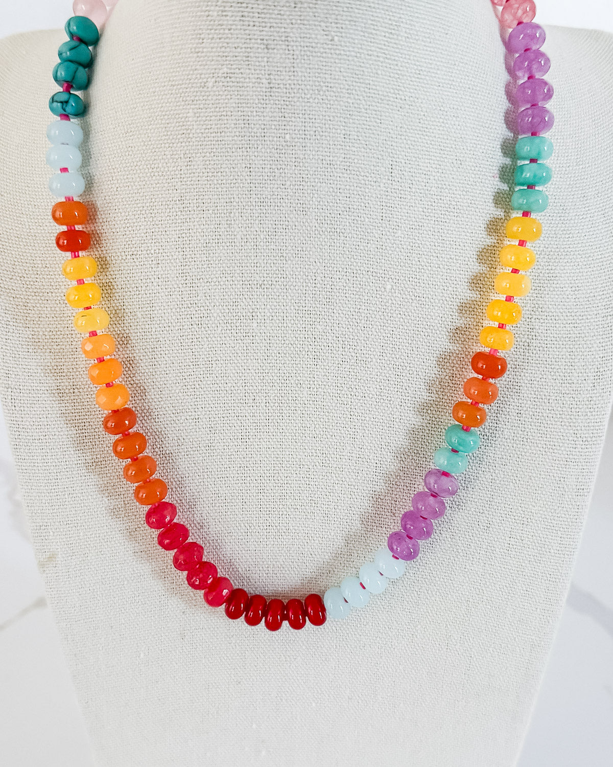 This natural stone beaded necklace just feels like summer! Featuring vibrant hues of pink, yellow, orange, blue and red, it's the perfect piece to add a pop of color to any summer outfit.