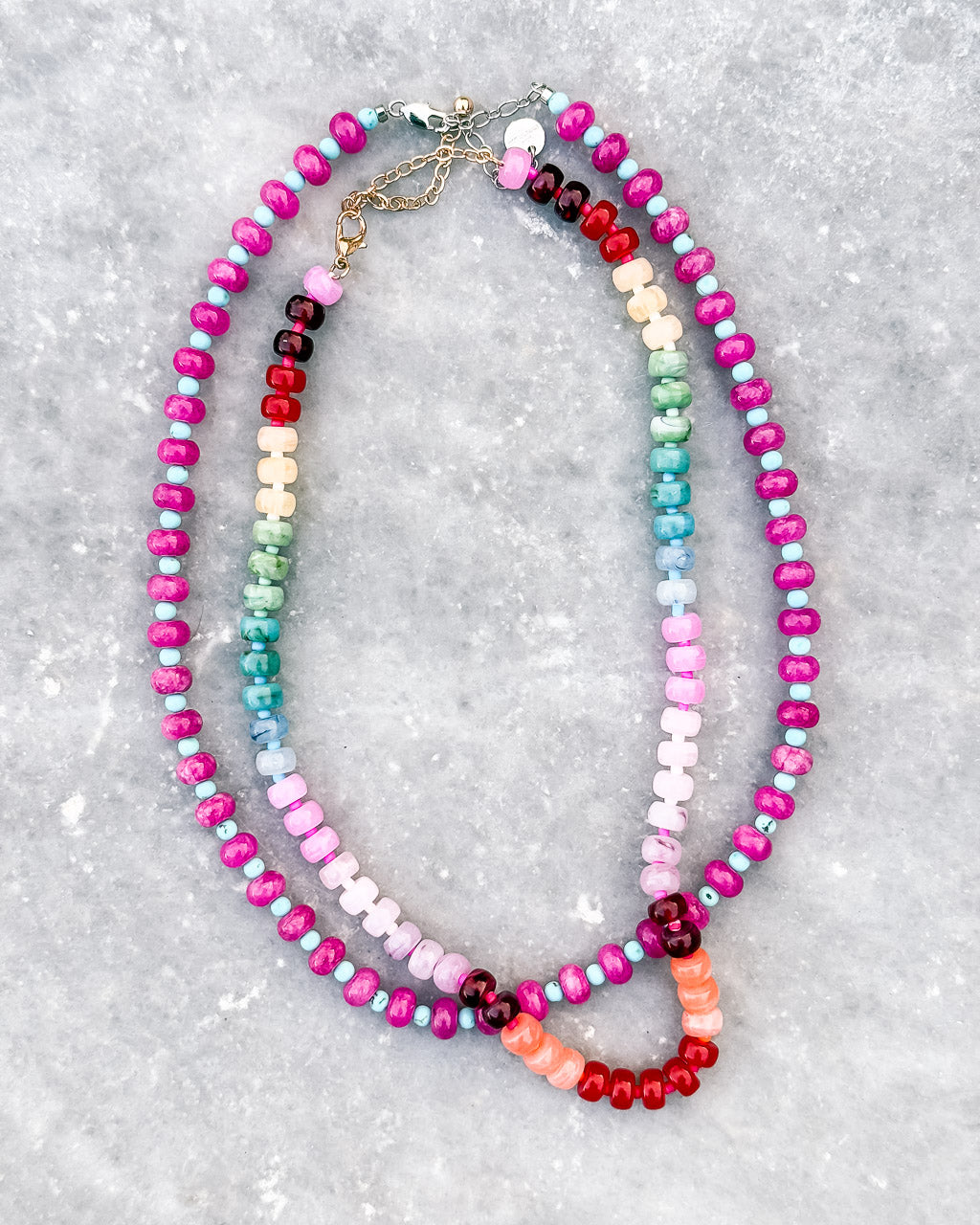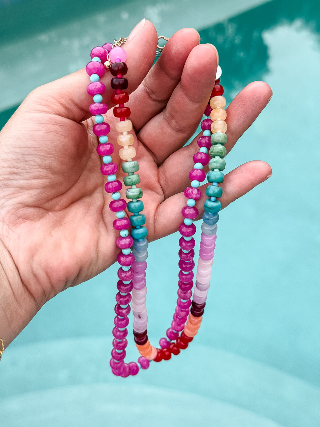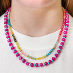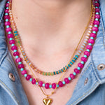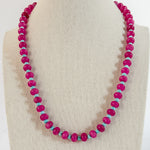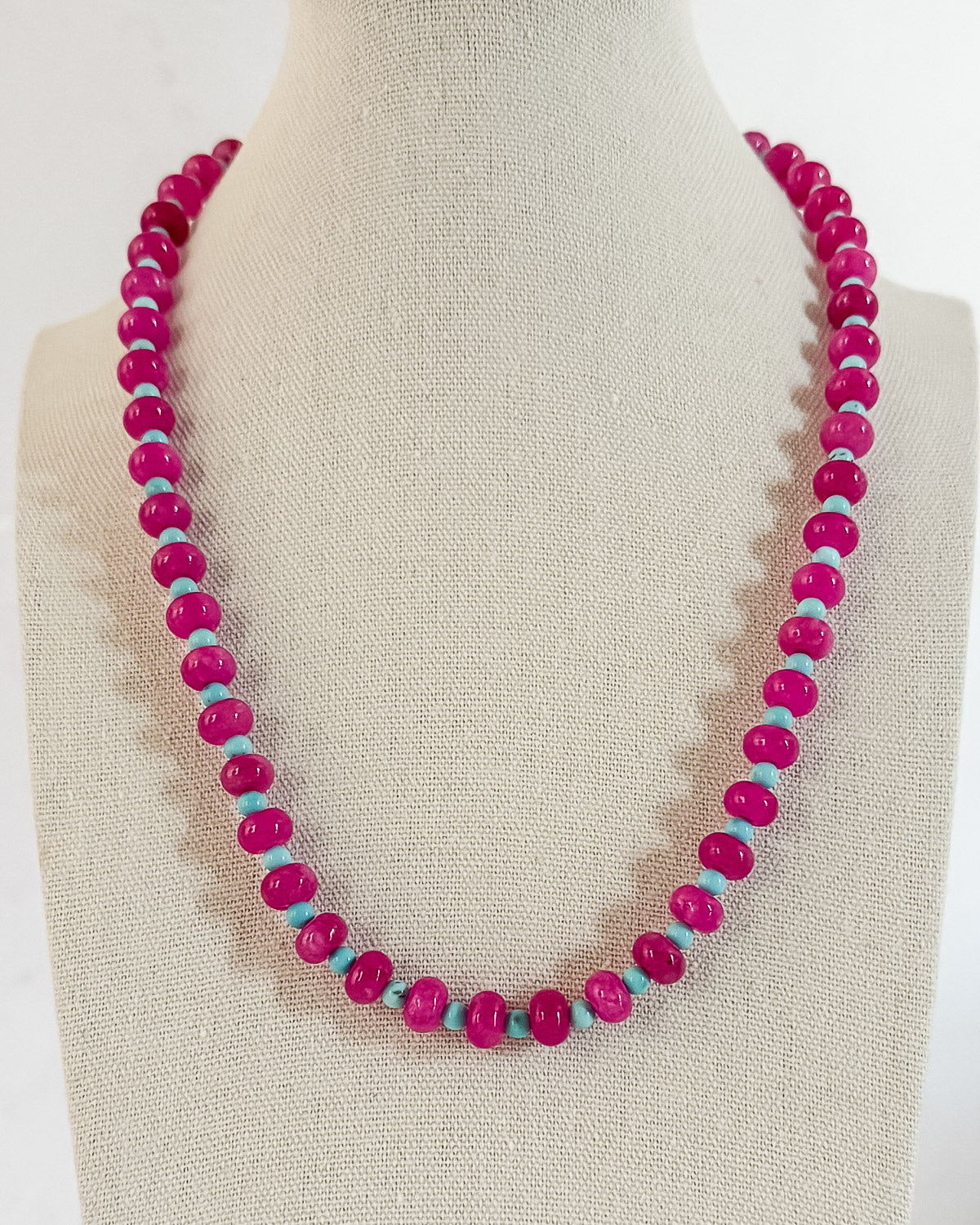 Make a bold statement with our Fuchsia Lagoon necklace. Delicate blue pine stone beads beautifully contrast the vibrant fuchsia natural stone beads. It's a show-stopping addition to any outfit.