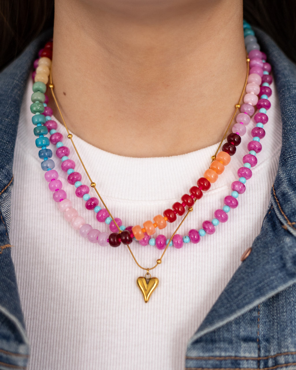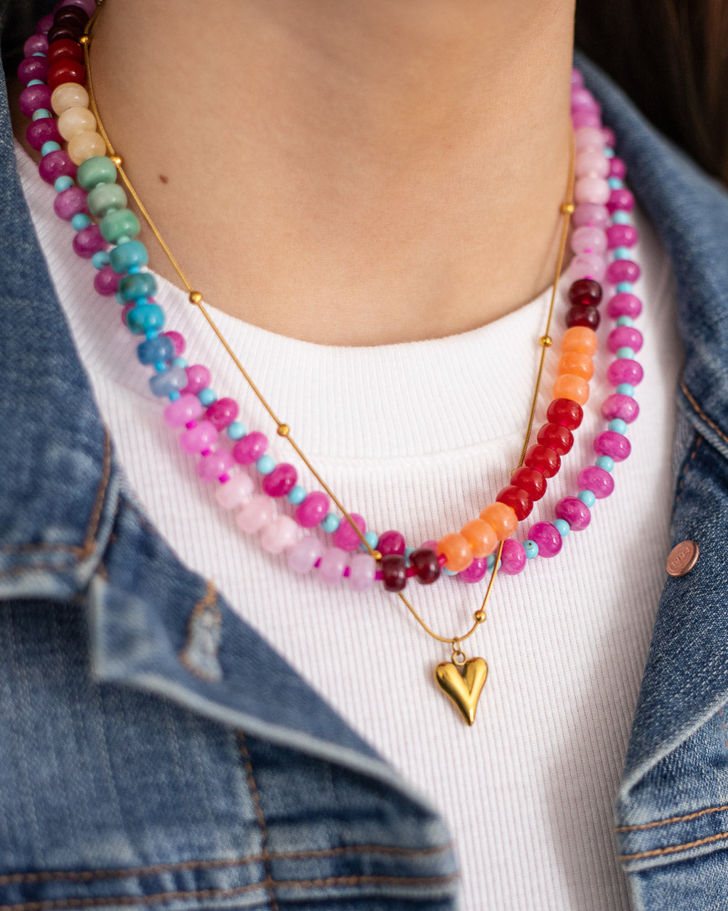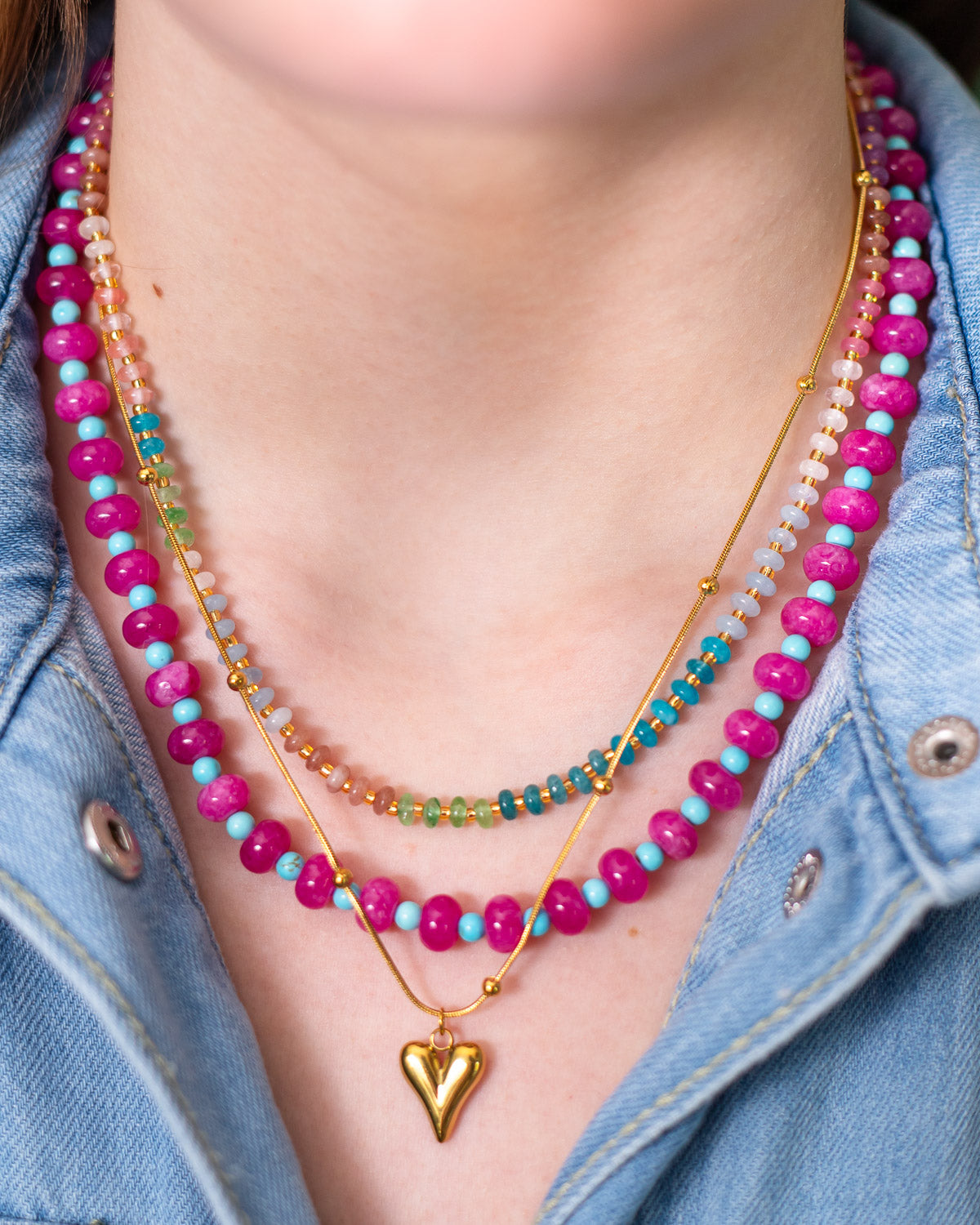 Make a bold statement with our Fuchsia Lagoon necklace. Delicate blue pine stone beads beautifully contrast the vibrant fuchsia natural stone beads. It's a show-stopping addition to any outfit.