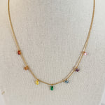 The Gold Spectrum Necklace features a delicate gold chain adorned with seven tiny crystal charms in rainbow hues. This subtle yet playful piece adds a touch of shine and joy to any outfit, perfect for layering or wearing on its own for a hint of colorful elegance.