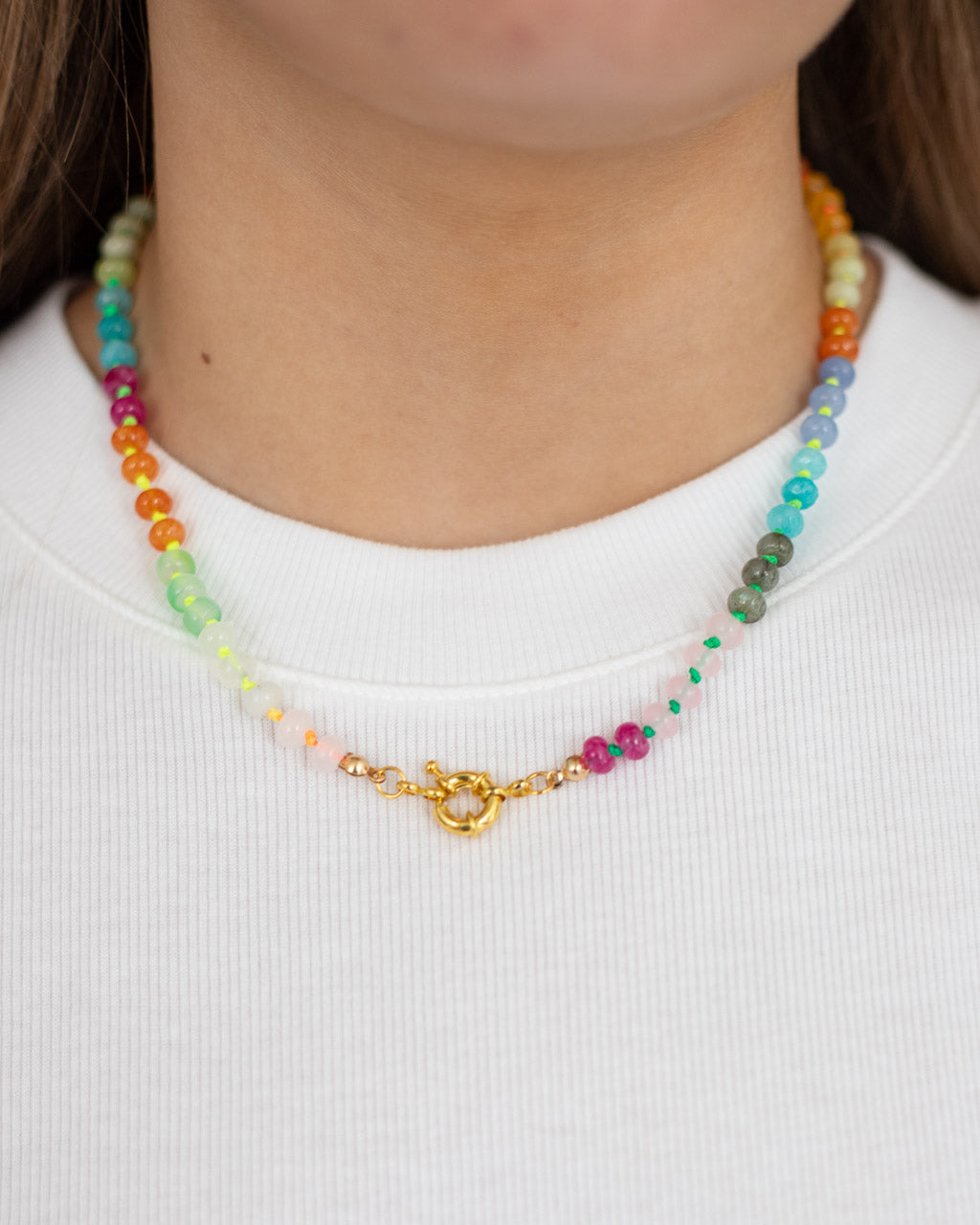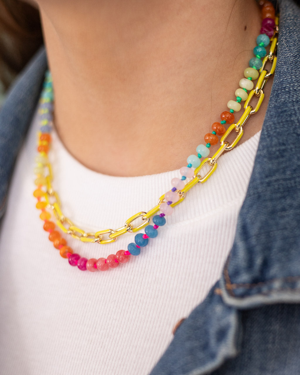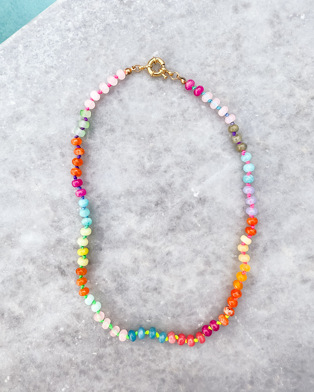 Inspired by recent travels to St. John, our Love City Brights Necklace is not here to blend in. Featuring bold, punchy stone beads on multi-colored neon cord, this necklace is a tribute to St. John’s colorful spirit and its nickname--Love City. Its vibrant, unapologetic energy is perfect for color lovers who aren't afraid to make a bold statement. Note: Each necklace is hand-knotted on color-changing cord, making every piece one-of-a-kind—so yours may look slightly different from the product photos (in the best way).