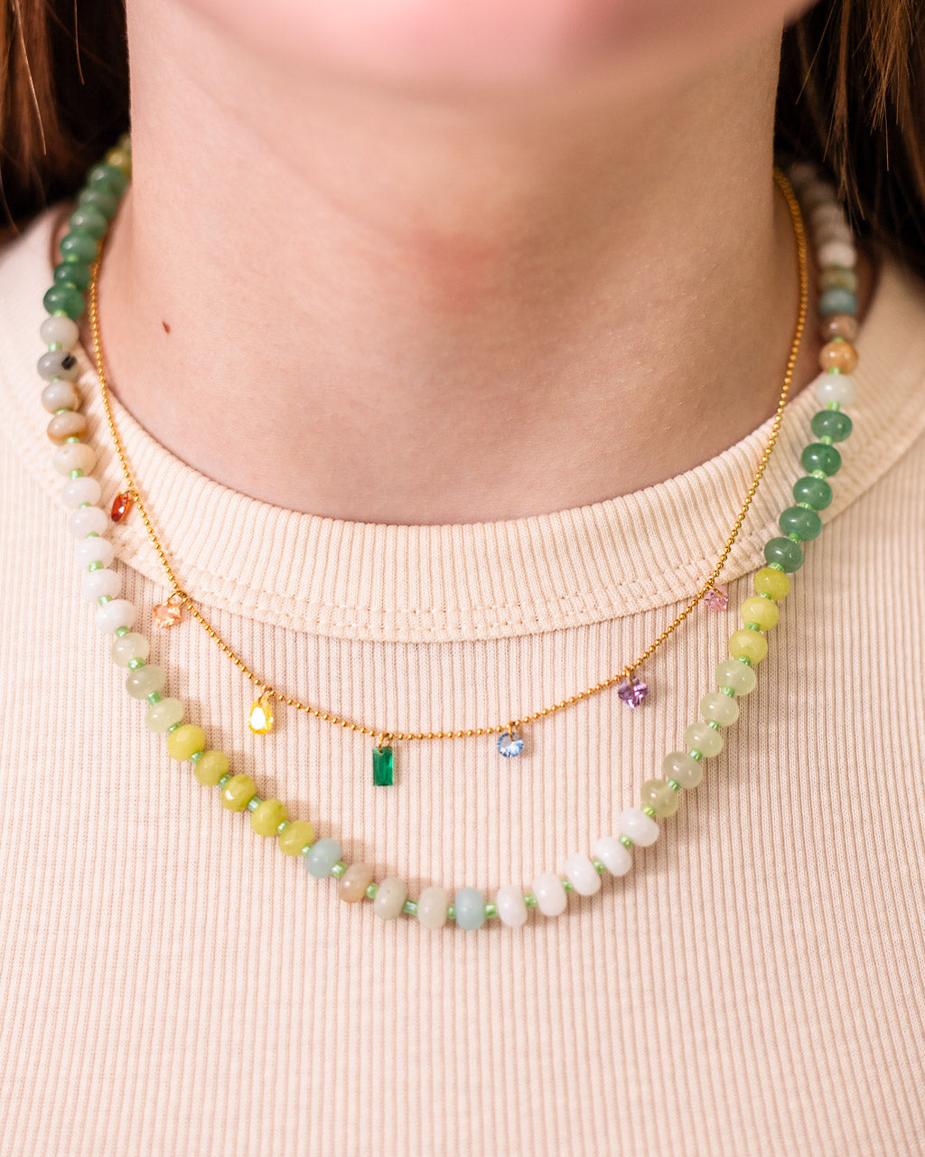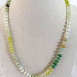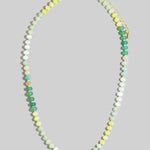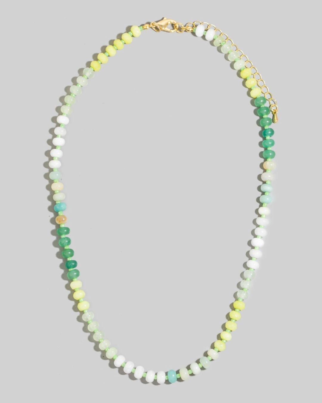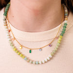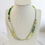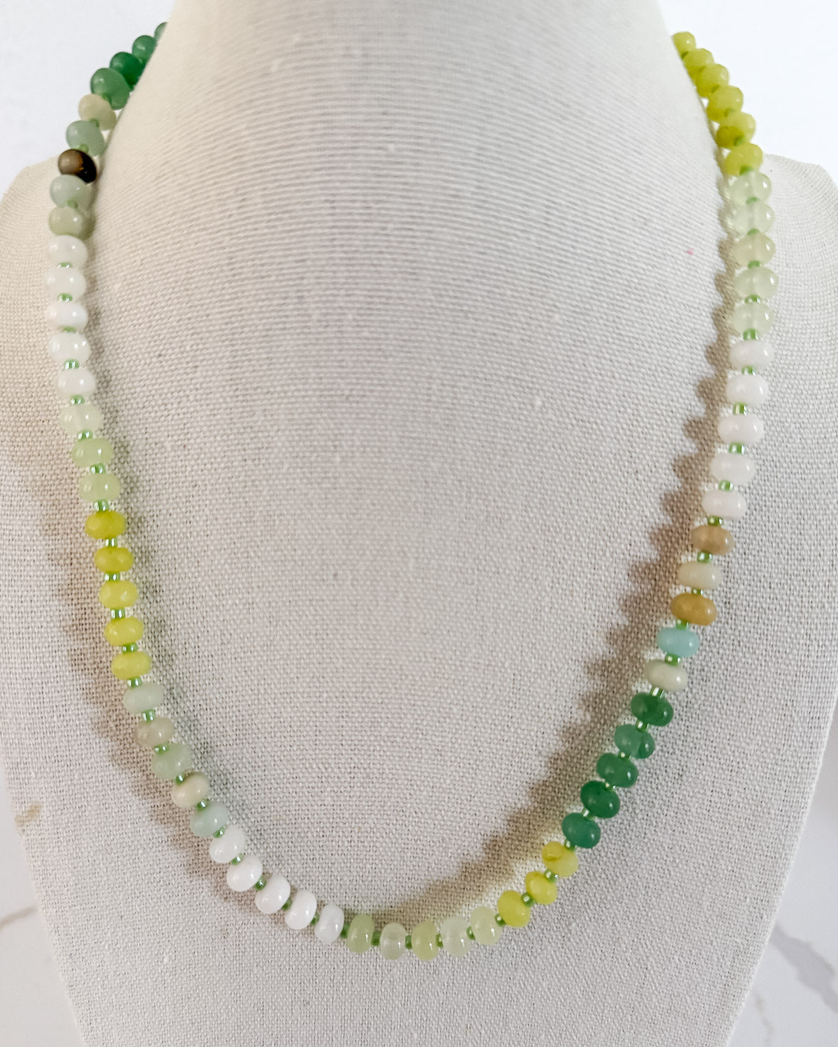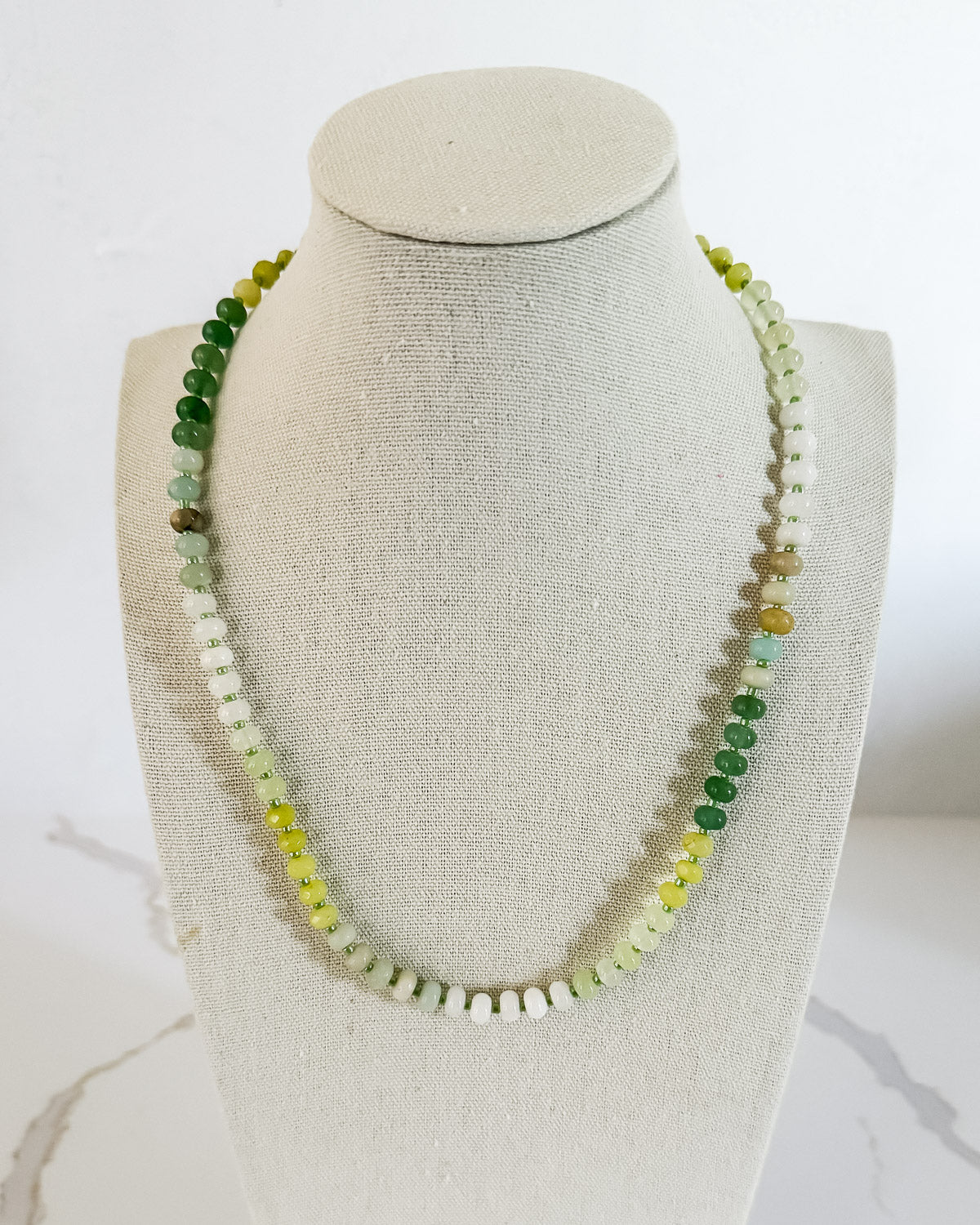 This natural stone beaded necklace features a delicate gradient of natural stone beads in soft, soothing shades of green. From pale mint to lush sage, each bead is hand-selected to create a harmonious flow of color, and it adds an effortless, organic elegance to any outfit. It is perfect for nature lovers and those who appreciate subtle, earthy beauty. The subtle greens also compliment our more colorful necklaces beautifully.