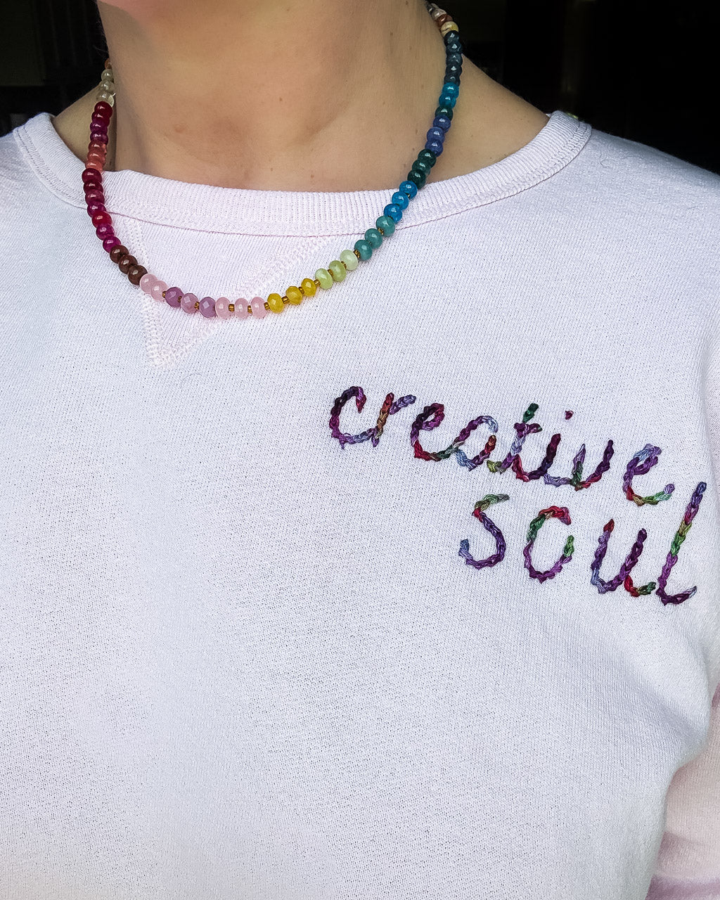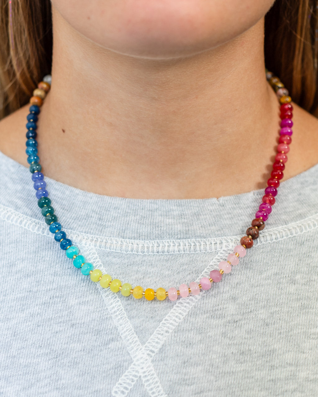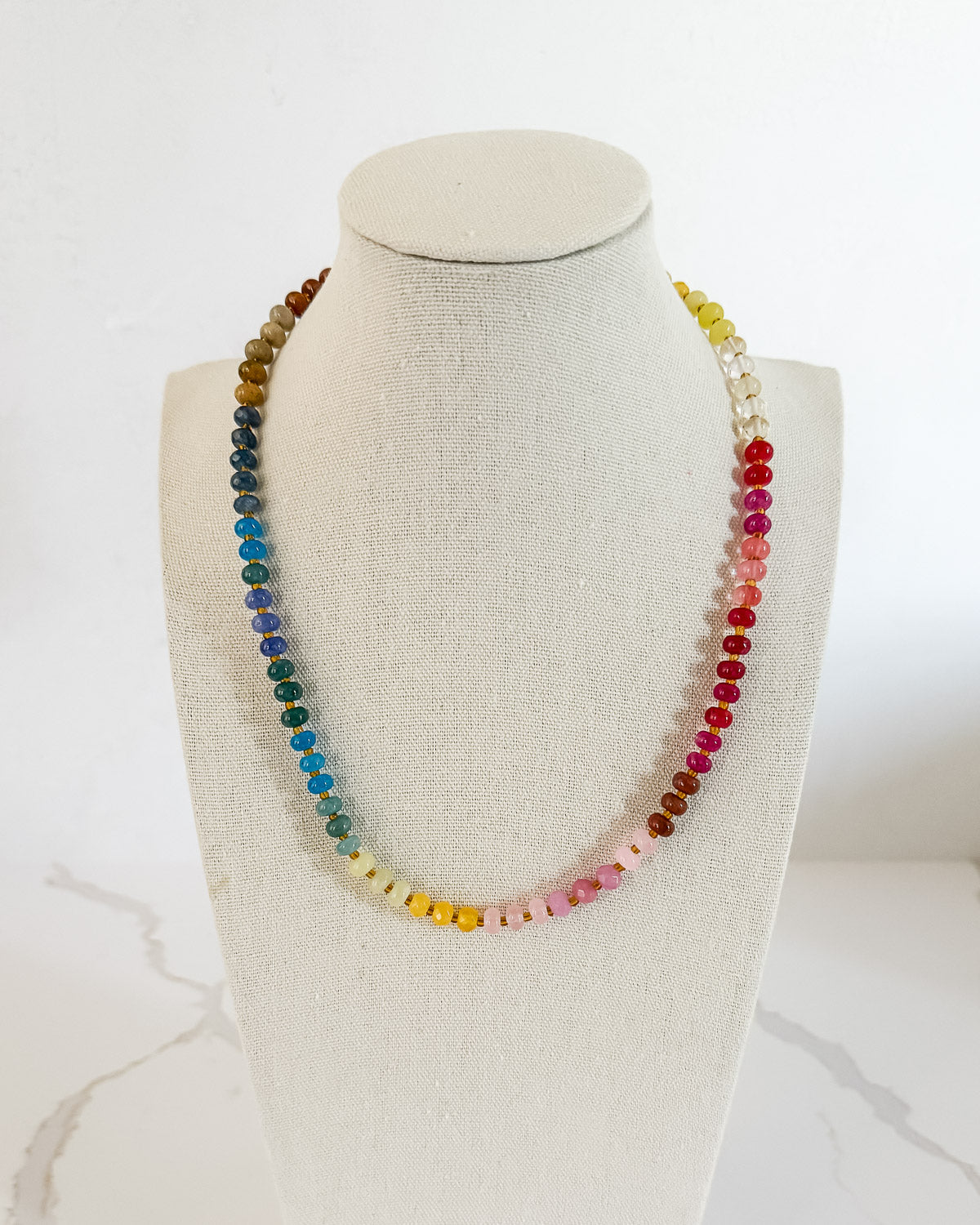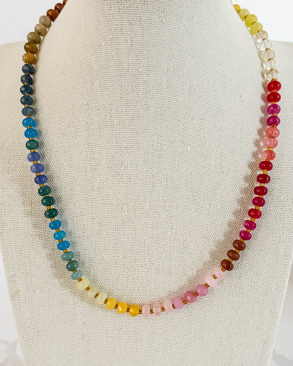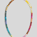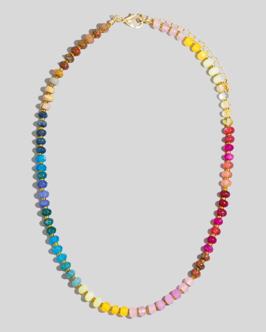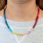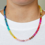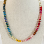 This natural stone beaded necklace features rich jewel tones in a refined rainbow palette, inspired by our colorful wall calendars. It makes a statement all on its own, but it also pairs beautifully with so many of our other colorful necklaces.