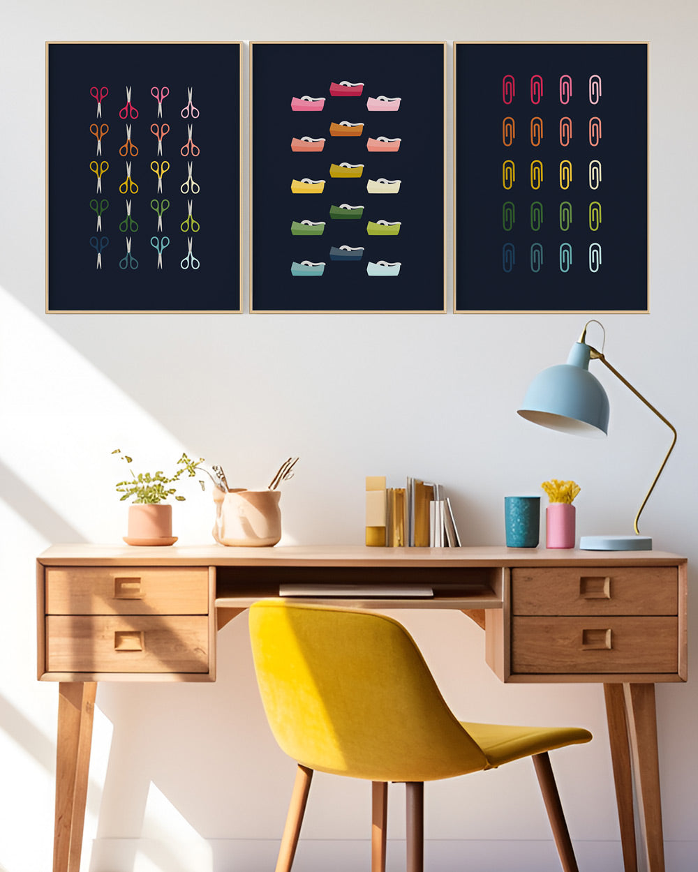 Transform your workspace or craft room with this delightful bundle of 5 digital art prints, ideal for offices and craft rooms alike. Each print features objects in vibrant, ombre rainbow hues set against a deep navy blue background, creating a striking and whimsical aesthetic. Featuring essential office objects such as paper clips, tape dispensers, binder clips, scissors, and push pins, these unique designs will add the perfect finishing touch to your space!